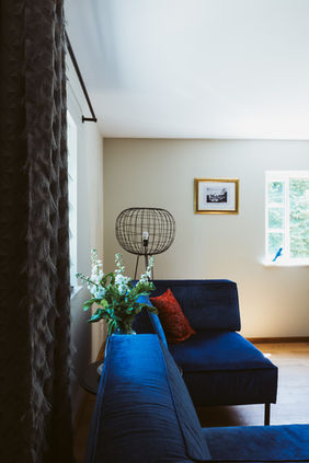 Klassisches Schwarz-Weiß und Preußisch Blau waren die Grundidee bei der Gestaltung dieser Wohnung. Eine moderne und unaufdringliche Küchenzeile, ein kleiner Esstisch und wunderbar bequeme Sessel teilen das Wohnzimmer unter sich auf. Im Dachgeschoss befindet sich das ebenfalls blaue Bett, sowie das schwarz-weiße Badezimmer. Der Blick aus dem Wohnzimmer geht ins Grüne.